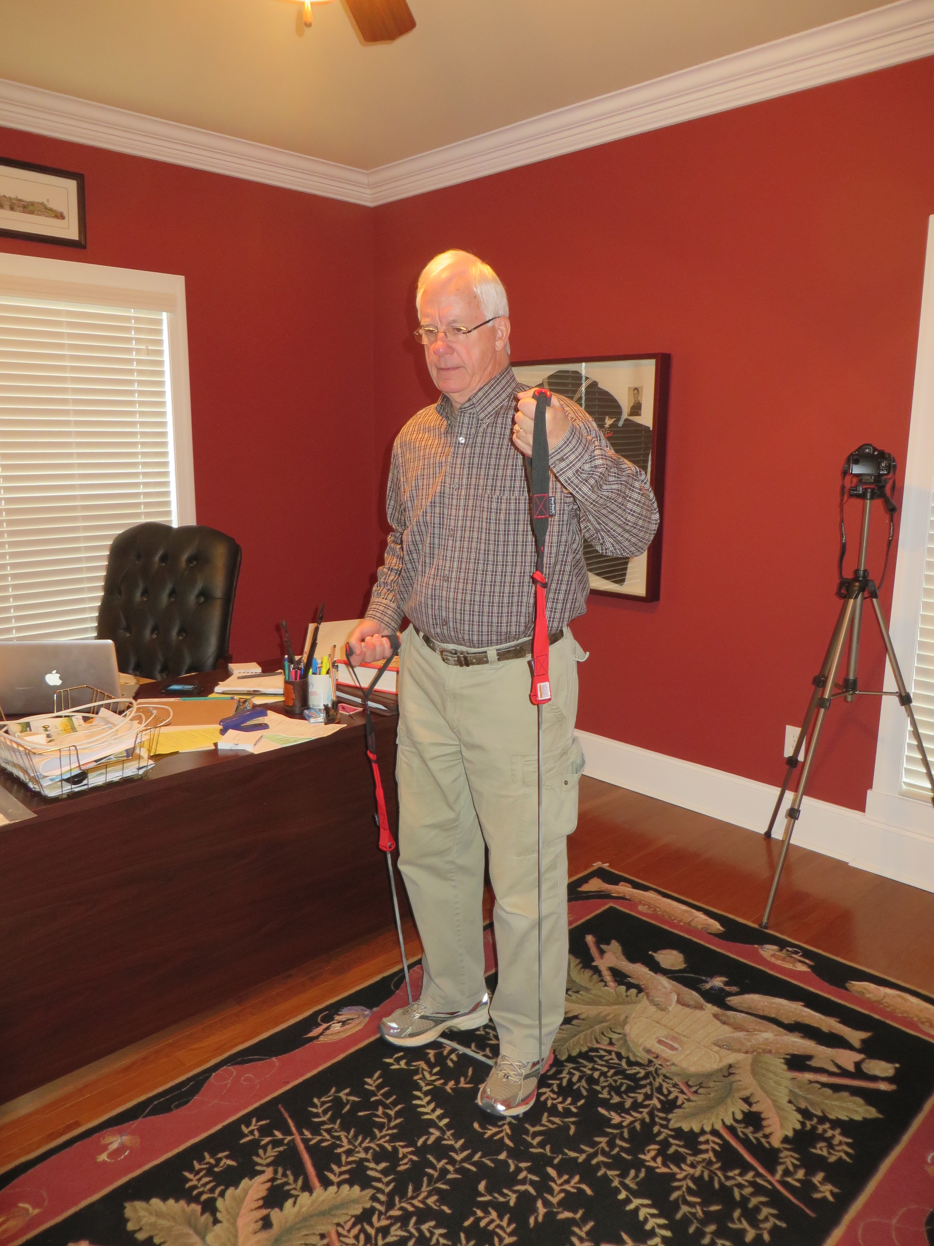 StandApp could extend your life AND enable you to enhance your enjoyment of future years. Did you realize that sitting in a comfortable chair for too many hours at a time will result in serious health problems? That’s right SITTING DOWN. I challenge you to Google it and see for yourself. StandApp to the rescue! You can choose the intervals from every 15 minutes to every 120 minutes and receive a reminder to get on your feet and flex those muscles for 5 minutes. There are more than 20 short videos to show you simple exercises you can do even in a small space. Remember to open the App when it sends the alert and it will take you to the exercise videos. Including this step allows the App to remind you in 5 minutes to get back to work. That is, sitting at your desk, at least. Here is a picture of one exercise I enjoy during the day using a very inexpensive training device.